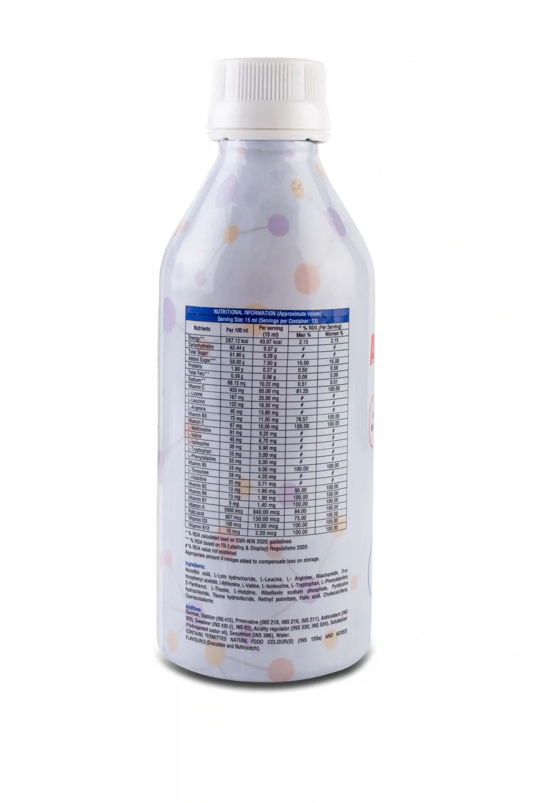 Each 15 ml serving delivers a potent blend of amino acids like L-Leucine, L-Isoleucine, L-Valine, and L-Arginine, along with a wide spectrum of vitamins including Vitamin A, B1, B2, B6, B12, C, D3, and E.